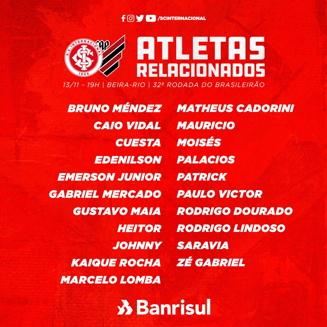 Ricardo Duarte / InterO Inter confirmou nesta sexta-feira a noite os relacionados para duelo contra o Athletico-PR, neste sábado, às 19 horas no Gigante da Beira-Rio. Três jogadores titulares voltam a ficar à disposição do técnico Diego Aguirre: Moisés, Saravia e Patrick. De desfalque, estão de fora o atacante Yuri Alberto e o meio-campista Gabriel Boschilia.