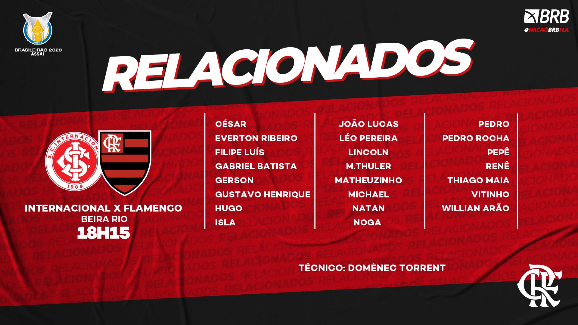 Marcelo Cortes / FlamengoO Flamengo divulgou a lista de relacionados para o duelo diante do Internacional neste domingo e válido pela 18ª rodada do Brasileiro. Há três retornos confirmados: o lateral-direito João Lucas, o zagueiro Gustavo Henrique e e o atacante Pedro Rocha. Por outro lado, os meias Diego Ribas e Arrascaeta são ausência.