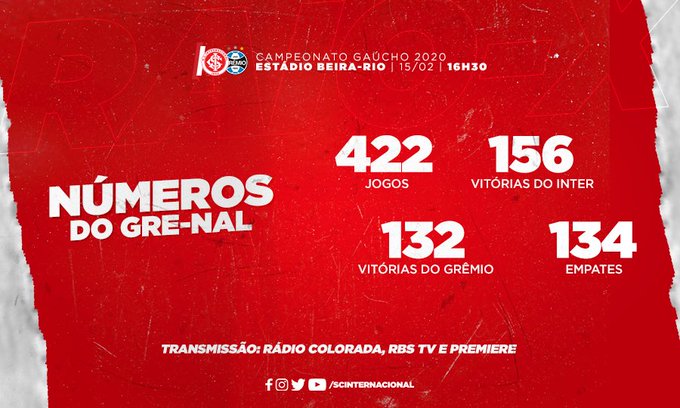 Site Oficial do InterNeste sábado às 16h30, o Inter terá pela frente um confronto com o seu maior rival em jogo único das semifinais do primeiro turno do campeonato Gaúcho. O clássico de número 423 na história, será mais um capítulo da maior rivalidade do Brasil, confira os números deste duelo eterno entre vermelhos e azuis.